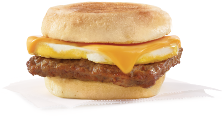 A fresh-cracked free-range egg and a grilled breakfast sausage covered in cheese on a warm Muffin. Simple breakfast perfection.