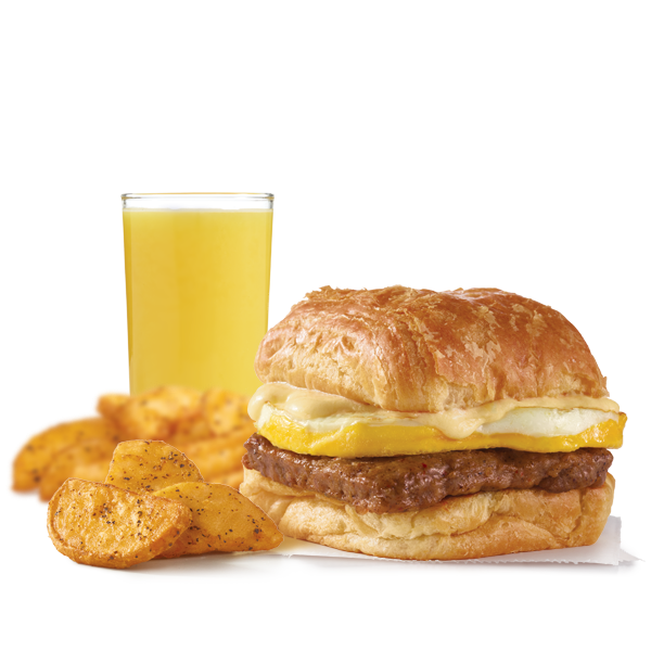 A fresh-cracked free range egg and grilled sausage covered in creamy cheese sauce on a flaky croissant bun. Theres a lot going on in this simple sandwich and its all delicious.